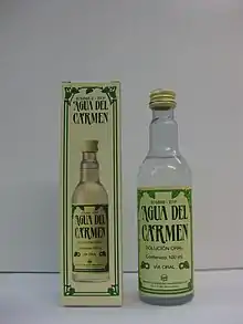 Agua del Carmen es un licor y remedio popular en España desde el inicio del siglo xx.[1] Elaborado con una fórmula de botica a partir de plantas medicinales, con un 55% de etanol (alcohol), se le atribuyen propiedades como tónico estomacal, antiespasmódico, carminativo y colerético,[2] si bien en algunos círculos está escasamente considerada e incluso denostada por las posibles connotaciones milagreras que sugiere su nombre y por las contraindicaciones en embarazo y lactancia.[lower-alpha 1][3]