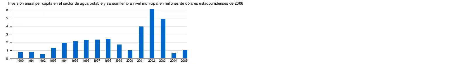 Entre 1990 y 2005, se invirtieron US$ 409 millones en el sector de agua potable y alcantarillado a nivel municipal. Como se puede observar en el diagrama, en 2002 se alcanzó el punto más alto, gastando US$ 6.1 per cápita. Sin embargo, el promedio anual entre 1990 y 2005 fue de solo US$ 2.1 per cápita.[12] Comparado con otros países Latinos, como los vecinos Perú y Colombia, el nivel de inversiones en el sector ecuatoriano es bajo.[13]