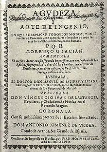 - AGUDEZA/ Y/ ARTE DE INGENIO,/ EN QUE SE EXPLICAN TODOS LOS MODOS Y DIFE-/ rencias de Concetos, con exemplares escogidos de todo lo / más bien dicho assi sacro, como humano./ POR/ LORENÇO GRACIAN./ AUMENTALA el mesmo Autor en esta segunda impresión, con un tratado de los/ Estilos, su propiedad, ideas del bien hablar: con el/ Arte de/ Erudicion y modo de aplicarla; Crisis de los Au-/ tores y noticias de libros./ ILUSTRALA/ EL DOCTOR DON MANUEL DE SALINAS Y LIZANA,/ Canonigo de la Cathedral de Huesca, con saçonadas traduc-/ ciones de los Epigramas de Marcial./ PUBLICALA/ DON VINCENCIO IUAN DE LASTANOSA/ Cavallero y Ciudadano de Huesca, en el/ Reyno de Aragón./ CORONALA/ con su nobilisima protección, el Excelentíssimo Señor/ DON ANTONIO XIMENEZ DE URREA,: Conde de Aranda & Grande de España./ Con licencia. Impresso en Huesca, por IUAN NOGUES, al Coso,/ Año MDCXLVIII.