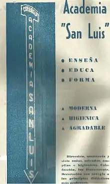 La Academia “San Luis” preparaba a peritos y profesores mercantiles, auxiliares de empresa y de banca diplomados, intérpretes de francés e inglés, preparaba también para bachiller (ingreso, primero, segundo, tercero, cuarto, reválida –enseñanza libre-) y magisterio, además de tener escuela preparatoria de niños dirigida por maestros nacionales. Enseñaban cultura general (Literatura Española y Literatura Universal, Geografía económica, Historia de la Cultura, Caligrafía, Gramática Española, Aritmética mercantil, Taquigrafía y Mecanografía, Composición y correspondencia comercial, etc.) –con carreras cortas que no necesitaban bachiller para empezar según el plan de la época: eran los diplomados por Escuelas de Comercio, la preparación era de 150 pesetas mensuales y no se realizaban gastos en libros por cuanto la Academia proporcionaba los apuntes gratuitos-, se enseñaba asimismo francés, inglés, alemán, latín y griego, contabilidad y cálculo mercantil y preparaban para oposiciones.[4]
