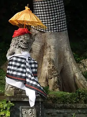 Tela con patrón de ajedrez (poleng) utilizada en un templo balinés hinduista para cubrir una estatua y un árbol.