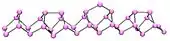 El fósforo monoclínico o fósforo violeta también es conocido como Fósforo metálico de Hittorf.[4][5] En 1865, Johann Wilhelm Hittorf calentó fósforo rojo en un tubo sellado a 530 °C. La parte superior del tubo se mantuvo a 444 °C. Grandes cristales opacos monoclínicos o romboédricos subliman. El fósforo violeta puede ser preparado al disolver fósforo blanco en plomo fundido en un tubo sellado a 500 °C por 18 horas. Bajo congelamiento lento, el alótropo de Hittorf se cristaliza. Los cristales pueden ser revelados al disolver el plomo en un diluyente de ácido nítrico seguido de un hervido en ácido clorhídrico concentrado.[6] Además, una forma fibrosa existe con cajas fosfóricas similares. Abajo se muestra una cadena de átomos de fósforo que exhiben tanto la forma fibrosa como la púrpura.
