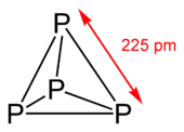 3), cada uno tiene una estructura tetraédrica similar. El arreglo tetraédrico resulta en una tensión anular e inestabilidad. La molécula es descrita como seis enlaces simples P–P. Dos distintas formas cristalinas son conocidas. La forma α, la cual es estable bajo condiciones estándar, tiene una estructura cristalina de cuerpo cúbico centrado en las caras. Se transforma de manera reversiva en la forma β a 195.2 K. La forma β se cree que tiene una estructura cristalina hexagonal.[1]