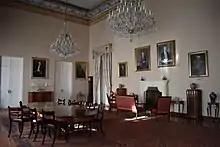 A la entrada principal se accede por una escalinata y la puerta está flanqueada por columnas que sostienen un trofeo de armas y un busto de bronce del Gran Maestre Manuel Pinto da Fonseca.[11][12] Sobre el busto se encuentra una ventana moldeada y coronada por el escudo de Pinto.[13] En el centro de la ventana se encuentran los escudos de Castilla y León y de Portugal.[1] Justo enfrente de la entrada se encuentran dos cañones históricos, que se utilizan actualmente como decoración.[14][15]