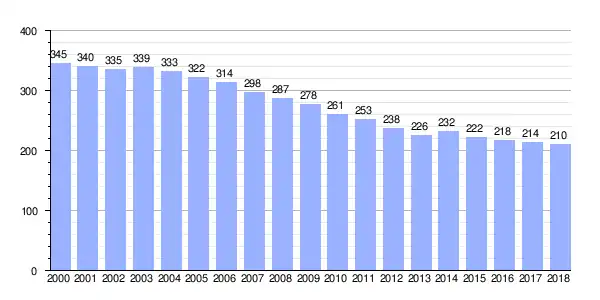 Gráfica de evolución demográfica de Alborés[3] entre 2000 y 2018 |