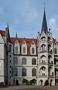 - Fachada occidental que da al patio interior y a la torre de la escalera de caracol.