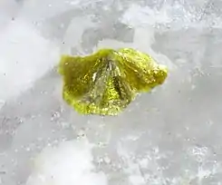![]() Alcantarillaíta. Sección de una esférula mostrando cristales laminares, sobre cuarzo. Mina Alcantarilla, Belalcázar (Córdoba) España. Anchura, 1,5 mm | ||