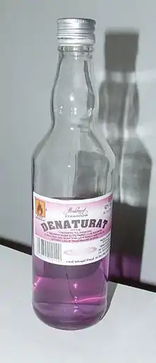 El alcohol desnaturalizado, también llamado alcohol metilado [1] es un producto de etanol que tiene aditivos para convertirlo en venenoso, con mal gusto, con un olor repugnante o causante de náuseas para desalentar el consumo recreativo . A veces se tiñe de manera que se pueda identificar visualmente. Se puede añadir piridina, metanol, [2] o ambos productos para hacer que el alcohol desnaturalizado sea venenoso, o también se puede añadir denatonio para hacerlo amargo.