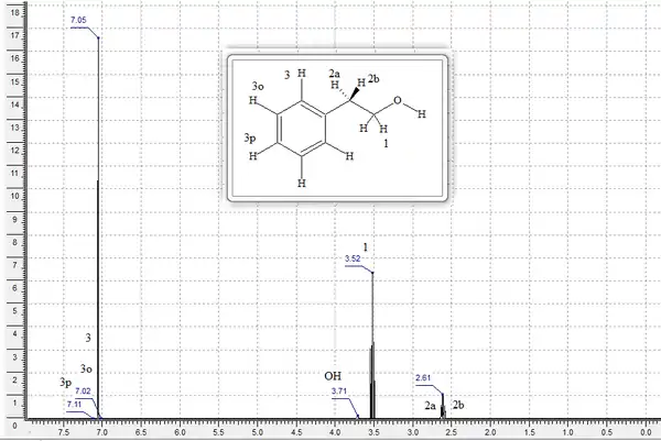 El espectro de resonancia de protón muestra una señal múltiple a campo más alto, correspondiente al metileno entre el anillo aromático y el hidroximetileno. Después se encuentra una señal a campo más bajo correspondiente a los hidrógenos del hidroximetileno, y a campo más bajo (aproximadamente a 7 ppm, zona donde aparecen los hidrógenos de anillos aromáticos) se encuentra la señal de los hidrógenos orto, meta y para con respecto al 2-hidroxietilo.