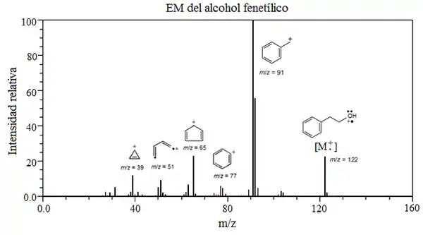 El espectro de masas muestra el ion molecular m/z 122, y el pico base es a m/z 91, debido al catión alílico. Como todos los compuestos aromáticos con un solo anillo de benceno, se observa la serie del benceno m/z 39,51,65 y 77.