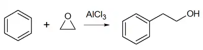 b) Reacción de Friedel y Crafts entre benceno y óxido de etileno: