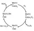 En un típico ciclo catalítico el sustrato es oxidado al producto en el centro de Molibdeno. Los equivalentes reducidos se trasladan al FAD que es reoxidado por el oxígeno molecular. Los centros de hierro funcionan como mediadores de la transfrencia de electrones entre el MoCo y el cofactor de flavina así como almacenadores de equivalentes reductores durante la catálisis.[3]
