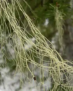 Alectoria sarmentosa (Ach.) Ach., es una especie de liquen fruticuloso de distribución cosmopolita que vive en bosques húmedos de coníferas. Este liquen puede alcanzar hasta 30 centímetros de longitud y posee pequeñas ramillas de sección circular que cuelgan sujetas por un único punto de unión al sustrato sobre el que crece, por lo general cortezas y ramas de coníferas. La morfología de este liquen hace que su nombre común en diversos idiomas haga referencia a su forma de cabellera, como barbas de viejo o pelo de bruja.[1] A diferencia de otros líquenes fruticulosos como los pertenecientes al género Usnea que tienen una médula rígida que los mantiene erectos Alectoria sarmentosa tiene engrosada la cutícula en diversas regiones permitiendo cierto grado de rigidez en el talo.[2]
