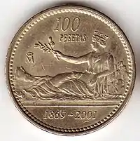 En 1869 es derrocada la reina Isabel II y se comienza a buscar un nuevo rey. En ese año nace la peseta con la alegoría de Hispania de la época de Adriano —en posición yacente y con una rama de olivo—. La diferencia es que estaba coronada con una corona mural en vez de una corona de laurel y añadieron un peñón aludiendo a Gibraltar. Sin embargo, no aparecía ninguna referencia a Hispania o a España. Más tarde añadirían la leyenda ESPAÑA.