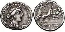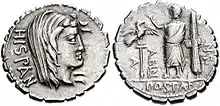 Existen también otra monedas relacionadas con Hispania, como varios denarios de la gens Annia (82-81 a. C.) con la leyenda HIS aludiendo a Hispania, pero sin representación alegórica. Otros denarios de la familia Coelia (51 a. C.) con la misma leyenda inscrita en un estandare y el jabalí, símbolo de la ciudad de Clunia (Hispania Tarraconense) en conmemoración por las victorias de Caius Coelius, gobernador de la Citerior. Asimismo se conserva un denario de la gens Fundania (101 a. C.) que probablemente haga referencia a la victoria sobre Numancia. Otro de la gens Fabia (127 a. C.), seguramente conmemorativo de las victorias sobre los lusitanos y su caudillo Viriato.[1]