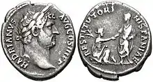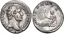 Adriano hacía frecuentes viajes a muchas provincias del Imperio, y para conmemorar estos viajes de forma propagandística se acuñaron monedas relativas a estos viajes por cada provincia. Una de ellas corresponde al viaje de Adriano a Hispania. La alegoría de Hispania más famosa se acuñó en Roma; era una figura femenina con una túnica larga, timbrada con laurel u olivo, reclinada hacia la izquierda, con su brazo izquierdo sobre unas rocas, que podrían hacer referencia a los Pirineos. Con su mano derecha sostiene una rama de olivo. A los pies de la figura aparece un conejo, el animal que teóricamente los fenicios emplearon para nombrar a la península: Hishphanim.