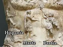 En la coraza de la estatua de Augusto de Prima Porta aparece Hispania en la parte diestra (a la izquierda según se mira la escultura). Se encuentra a espaldas de Marte, dios de la guerra, en posición sedente y afligida portando la gladius hispaniensis. El hecho de que se haya representado de espaldas a Marte y derrotada alude a la victoria de Augusto frente a cántabros y astures.[3]