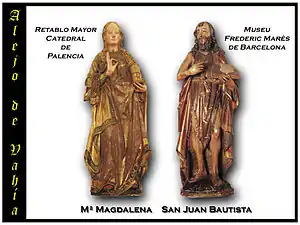una de señor Sant Juan Batista y otra de la Madalena, de bulto y madera de nogal bueno sano y limpio, acabadas en perfeçión y puestas en Palencia, todo a su costa solo lo que toca a su ofiçio de ymaginario. Conviene a saber: con sus insynias, e la de Sant Juan en que aya çinco palmos y medio de vara para la parte de la mano yzquierda de la Asunçión en el medio, y la de la Madalena en que aya çinco palmos de vara para la mano derecha de la Asunción en lo alto.[8]
