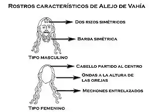 También es muy característico el tratamiento que hace de las barbas. Partiendo de las comisuras de la boca, dibuja unas ondas simétricas que dejan un vacío debajo del labio inferior en forma de copa. Además, cuando el cabello es ensortijado, la barba lleva también rizos circulares.