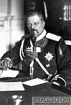 Condecoraciones | Caballero de la Orden de San Alejandro Nevski, Caballero de primera clase de la Orden de Santa Ana, Caballero de segunda clase de la Orden de Santa Ana, Caballero de tercera clase de la Orden de Santa Ana, Caballero de cuarta clase de la Orden de Santa Ana, Orden del Águila Blanca, Orden de San Estanislao, primera clase, Orden de San Estanislao (2.ª clase), Caballero de cuarta clase de la Orden de San Vladimiro, Caballero de tercera clase de la Orden de San Estanislao, Caballero de segunda clase de la Orden de San Vladimiro, Caballero de tercera clase de la Orden de San Vladimir, Caballero de primera clase de la Orden de San Vladimir, Orden de San Andrés y Caballero de primera clase de la Orden del Águila Roja. | |