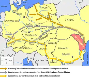 Los emigrantes del Sur de Alemania se desplazaron siguiendo el curso del Danubio desde Ulm (a unos 100 km al sudeste de Stuttgart y 130 km al noroeste de Múnich). Allí se embarcaron en botes Ulm, un tipo de barco de sentido único. Muchos emigrantes cayeron enfermos y murieron mientras viajaban en estos barcos. El viaje les llevó río abajo al delta del Danubio poco antes de llegar al Mar Negro. Una vez que llegaron a Izmail, los emigrantes fueron puestos en cuarantena durante semanas en una isla en el delta, lo que provocó más víctimas. Sobre el 10% de los emigrantes se piensa que no sobrevivieron al viaje.