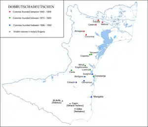 Los primeros colonos germanohablantes llegaron entre 1841 y 1856 desde el Imperio ruso. Eran familias de campesinos de las áreas cercanas a Besarabia y Jersón, que emigraron de allí debido a la recesión económica en sus territorios de origen. Treinta años más tarde llegó otro contingente de colonos desde Suabia. Durante este período, Dobruja aún pertenecía al Imperio otomano, y los colonos estaban sujetos a la regulación que sobre la colonización venía de Turquía. Consecuentemente, los alemanes de Dobruja fueron los únicos alemanes étnicos que estuvieron sujetos al poder turco sin haberse trasladado a Turquía (tal y como hicieron los alemanes del Bósforo. Contribuyeron al desarrollo agrícola de las fértiles estepas.