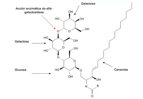 El gen GLA es el responsable de la codificación de la enzima alfa-galactosidasa. Esta enzima es activa en los lisosomas, estructuras que actúan como centros de reciclaje en las células. En los lisosomas se utilizan enzimas para procesar componentes celulares desgastados y reciclar las partes utilizadas. Una de estas enzimas es la alfa-galactosidasa, que rompe una molécula llamada globotriaosilceramida, que consta de tres azúcares unidos a un grupo lipídico. Esta molécula es degradada como parte normal del reciclaje de glóbulos rojos (eritrócitos) viejos y otros tipos de células.[5]