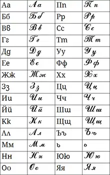 Los nombres de la mayoría de las letras son representaciones simples de sus valores fonéticos, con las consonantes seguidas de /ɤ/, por lo que el alfabeto se lee así: /a/ - b /ɤ/ - /vɤ/ etc. Sin embargo, la letra Й se llama "i-Kratko" (y corta), el de Ъ es "er-goliam" (yer grande), y el de Ь es "er-malak" (yer pequeña). A menudo la letra Ъ es llamada sencillamente como /ɤ/.
