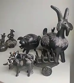 Otros elementos que también son parte de la elaboración de las piezas son: guano de vacuno, leña, guano de caballo y enjundia de gallina.[8] En el caso del primero, se utiliza para cocer la loza. El segundo se usa para la cocción de las figuras y también para la construcción de la base en la que se distribuye el guano de vacuno. Se suele comprar, aunque también se suele recolectar por terrenos aledaños. El tercero se manipula como base para el teñido de las piezas. Y, el cuarto, consiste en una grasa que se utiliza para lustrar las figuras y darles brillo. En ocasiones, los cultores pueden elegir cambiar el uso de algunos de estos elementos, reemplazando, por ejemplo, él guano de caballo por aserrín, paja de trigo y paja de arroz.[8]