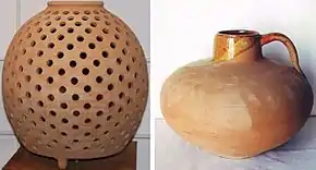 - Piezas de agua originales como el cántaro de Navarrete o cántaro de "novia", aplastado, de boca ancha y diseñado para que las mocitas aprendieran a caminar con él sobre la cabeza.[12] Otro objeto curioso es el barril de campo (también llamado rayado o de boca), que recibe su nombre por el adorno de acanaladuras horizontales que el alfarero hace con los nudillos de sus manos.
