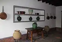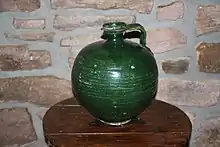Típica y popular en esta localidad es la alfarería vidriada en verde, marrón y blanco, para orzas,[lower-alpha 1] perulas,[lower-alpha 2][10][11] lebrillos, bacines, morteros, etc.[12] Cabe añadir información descriptiva sobre las referidas orzas de matanza, de perfil panzudo y con dos asas y borde resaltado, decoradas con una cenefa vegetal (las más pequeñas) o un ramo (las grandes),[lower-alpha 3] siguiendo la técnica de origen andalusí conocida como "verde y manganeso".