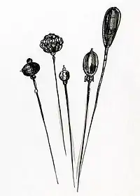 - «hatpin | ornament». Encyclopedia Britannica (en inglés). Consultado el 13 de mayo de 2017.
