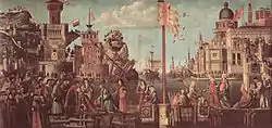 También se solían colgar sobre balaustradas o fuera de las ventanas para ocasiones festivas, como las procesiones a través de Venecia que muestran en sus obras Vittore Carpaccio o Gentile Bellini; cuando la Santa Úrsula de Carpaccio se embarca, las cuelgan sobre los costados de las embarcaciones y puentes peatonales.[23]