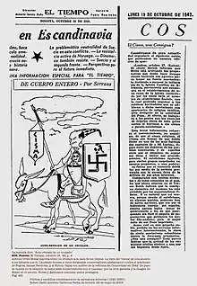 Alfonso Uribe Misas marcha como un cruzado a la caza de los impíos. La vara del "Cisma" es una alusión a los debates que él, Laureano Gómez y otros dirigentes conservadores adelantaron contra el arzobispo de Bogotá.