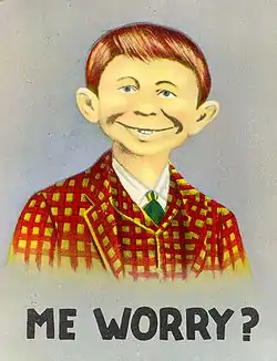 Mad cambió su formato a uno de revista a partir del número 24 (julio de 1955), y el rostro de Neuman apareció en la parte superior del borde ilustrado que se utilizó en las portadas, con su frase característica, ya familiar, "¿Qué, yo preocupado?" escrita debajo. Inicialmente, la frase se había escrito "¿Qué? ¿Yo preocupado?" Estos bordes se usarían por cinco números más, hasta la edición de diciembre de 1956.