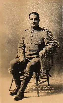 Alfredo Aragón fue un militar mexicano que participó en la Revolución mexicana. Nació en la Ciudad de México en 1885. Alcanzó el grado de Teniente Coronel constitucionalista y formó parte del Estado Mayor de Venustiano Carranza siendo él uno de sus más allegados, por lo que también tuvo puestos consulares en Francia –Burdeos, Argelia y París-. Fue un Miembro de la Société Astronómique de France, la Société de París, la Internationale d´Histoire de France y la Société de Americanistes de París. Colaboró escribiendo artículos en los periódicos de El Universal y el Globo. En 1906 escribió Scénes de la Révolution Mexicaine. Murió en París en 1936.