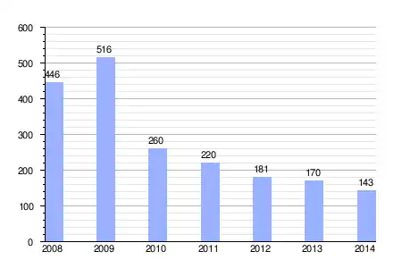 Gráfica de evolución de la deuda viva del ayuntamiento entre 2008 y 2014 |