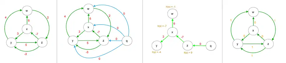 En la imagen de la izquierda tiene dos aristas negativas y no contiene ciclos negativos. En la segunda imagen se muestra el nuevo vértice q con peso 0 hacia todos los nodos. En la tercera imagen, se muestra el árbol de caminos mínimos calculado con el algoritmo de Bellman-Ford con q como vértice inicial, y los valores h(v) calculados para cada otro nodo como la longitud del camino más corto entre q y ese nodo. A modo de ilustración, en dicha imagen solo aparecen los caminos que se tomarían para determinar cada valor h(v). Nótese que todos estos valores h(v) no son positivos, porque q tiene una arista de unión con cada nodo de peso 0, y por tanto el camino más corto no puede ser mayor que ese valor. En la parte derecha se muestra el grafo modificado, hecho reemplazando el peso de cada arista w(u, v) por w(u, v) + h(u) – h(v). En este grafo modificado, todos los pesos de las aristas son positivos y el camino más corto entre dos nodos cualesquiera usa la misma secuencia de aristas que en el camino más corto entre los mismos dos nodos en el grafo original. El algoritmo concluye aplicando el algoritmo de Dijkstra para cada uno de los cuatro nodos originales en el grafo modificado (cuarta imagen).