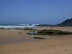 Junto a la playa orientación norte se puede observar la imponente rasa mareal, tallada de pizarra y grauvaca, de color acentuadamente gris y negro. Ya al sur se encuentra una ladera verde sobre el valle. Brota formaciones rocosas muy bellas, son vestigios de una antigua duna, ahora fosilizada, en este sitio existen plantas únicas en el mundo. Con el mar, el espectáculo es incluso muy bello porque pone al descubierto formaciones rocosas fosilizadas y se forman extensas en la arena en la que tiene una agua, temperatura por encima de los 20 °C. Playa también muy buscada por los deportes radicales que proporciona, surf y bodyboard.
