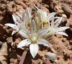 Allium nevadense ss nativa del oeste de los Estados Unidos, donde crece en suelos arenosos y rocosos. Crece de un bulbo color marrón o gris que mide de uno a uno y medio centímetros de ancho y que puede tener uno o dos bulbillos asociados. El tallo puede parecer breve, si el bulbo tiene más que unos pocos centímetros por debajo de la superficie de la tierra. El tallo está rematado con una inflorescencia de hasta 25 flores. Los pétalos pueden ser de color blanco o rosa con rayas más oscuras.