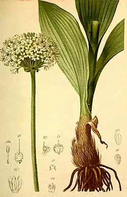 Allium victorialis es una especie que engaña a la gente, con el follaje de Convallaria. Es una especie que se encuentra en gran parte del hemisferio norte, desde Alaska a través de Asia, China y Europa. Puede ser muy variable como se puede esperar de su distribución. En junio, las flores blancas aparecen, seguidas en julio por las de cápsulas de semillas abiertas y redondas, de color negro brillante.[2]