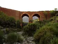 Acueducto de apreciables dimensiones que canaliza la acequia Gorda. Conformado por dos arcos centrales y dos laterales de medio punto, rebajados, construidos en mampostería.