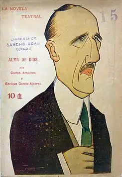 ![]() Caricatura de Arniches por Tovar para una edición de Alma de dios publicada en La Novela Teatral (1917) | ||