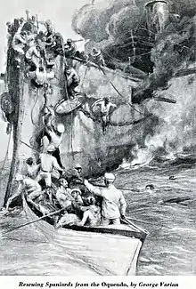 Faltaba allí el valiente comandante del Oquendo, mi querido compañero de toda la vida D. Juan Lazaga, que con su gloriosa memoria dejará como ejemplo a todos los hombres de mar del mundo la salida del puerto de Santiago y la vuelta al bajo del Diamante, hecha como si se tratara de una salida de todos los días, teniendo ya su buque completamente destrozado y habiendo reventado un proyectil de 20 centímetros dentro de la torre de proa. En estas condiciones despidió cariñosamente al práctico y acabó de sacar su crucero con toda tranquilidad, realizando el acto más admirable de todo el combate. Faltaba también su segundo, Sola, partido en dos por un proyectil; el tercer jefe Matos, y los tres tenientes de navío más antiguos, y faltaban hasta 121 individuos, todos muertos, de aquella heroica dotación.Víctor M. Concas y Palau, La escuadra del almirante Cervera