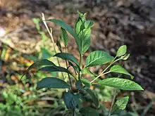 Las hojas son estrechas y ovales, 5-13 cm de largo y tienen un tallo 1,5 a 2,5 cm de largo. Ambos extremos son puntiagudos. La hoja muestra de siete a nueve pares de nervios. El borde de la hoja está finamente aserrado. El haz de la hoja es verde oscuro brillante, el envés es más claro. Los amentos masculinos son de color pardo amarillento a pardo rojizo, mientras que las flores femeninas tienen estróbilos pardo purpúreos.