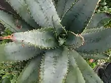 Especie de tallo único, con hojas dispuestas en roseta de entre 0,60 a 1 metro de alto y 30 cm (-100) de ancho. Las hojas son largas y bastante anchas en la base (unos 12 cm), de color verde, curvadas hacia el interior y de forma redondeada, aunque con la edad van abriéndose. Los márgenes están festoneados por espinas triangulares de color marrón rojizo. Una característica distintiva de la hoja es la presencia de numerosas espinas en la superficie externa.