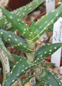 Numerosos rosetas se forman en los tallos procumbentes que puede alcanzar hasta 70 cm de altura. Las hojas son suculentas y de forma triangular, hoja superficiales están marcadas con manchas blancas con entrenudos en las plantas jóvenes, estrechas y retorcidas arriba, tiene 200 mm de longitud, son de superficies lisas y marcados con numerosas manchas blancas. Los márgenes están armados con diminutos dientes blancos.