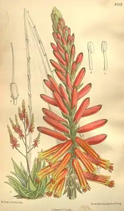 Es una planta herbácea perennifolia o árbol pequeño, solitario, por lo general caulescente, con un tallo grueso simple que alcanza los 2 (4) metros de altura cubierto de hojas secas persistentes. Las hojas formando una roseta compacta, erecta; la lámina de 60 cm de largo, y 12 cm de ancho en la base, lanceoladas, de color verde grisáceo pálido, teñida de rojo en un lugar seco, sin manchas en la madurez, pero con algunos puntos presentes en las plantas jóvenes; de márgenes cartilaginosos, con dientes de color marrón rojizo y con la savia seca de color amarillo. La inflorescencia es erecta de 1-2 m de altura por encima de la roseta de hojas, en forma de racimos de 30-60 × 6 cm, cilíndrico-acuminados. El perianto de color rosado-rojo, amarillo hacia la boca. El fruto es una cápsula de 20 x 10 mm, oblongo-ovoides, de color marrón grisáceo pálido. Semillas de 4,5 × 8,5 mm, color negro con grandes alas blancas.