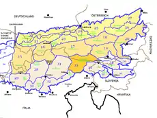 ![]() Alpes orientales según la SOIUSA, con los Alpes Cárnicos y del Gail destacados en naranja. | ||