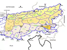 ![]() Alpes orientales según la SOIUSA, con los Alpes de Carintia y de Eslovenia destacados en naranja. | ||